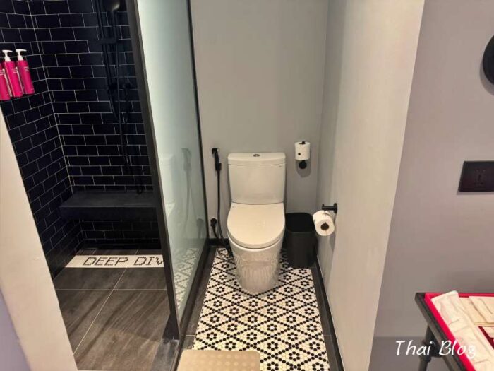 トイレはシャワーブースとガラスで仕切られた空間にあります。