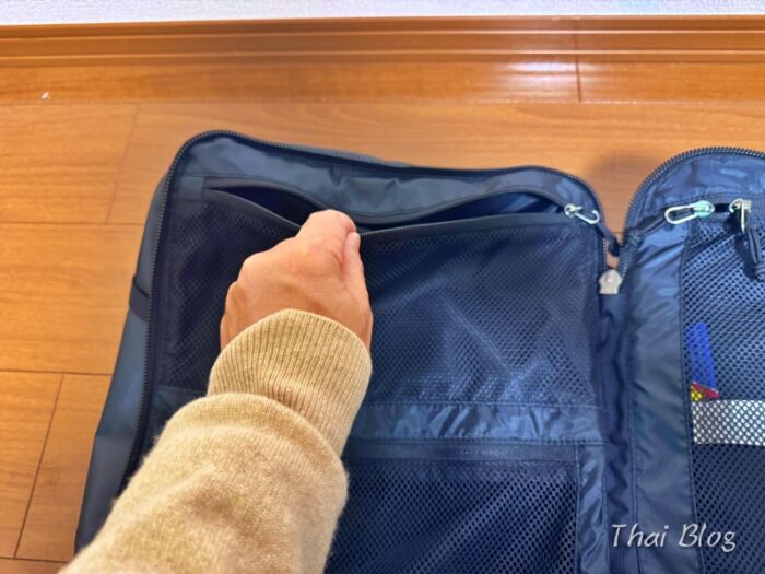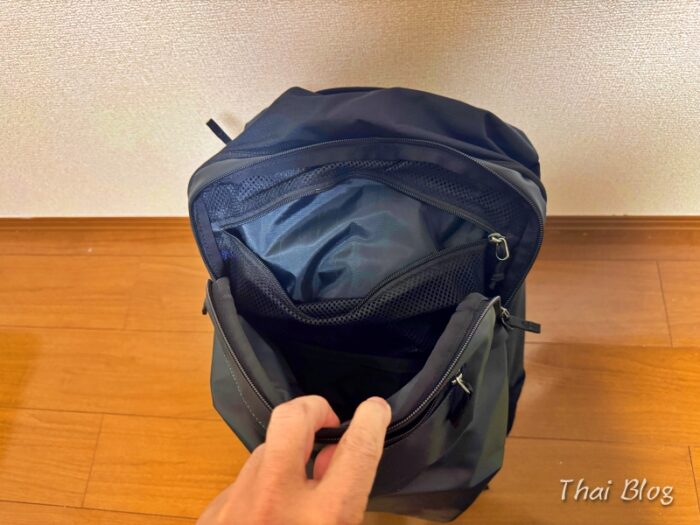メイン収納部の上部には、小物や薄手のものがいれられるポケットがあります。