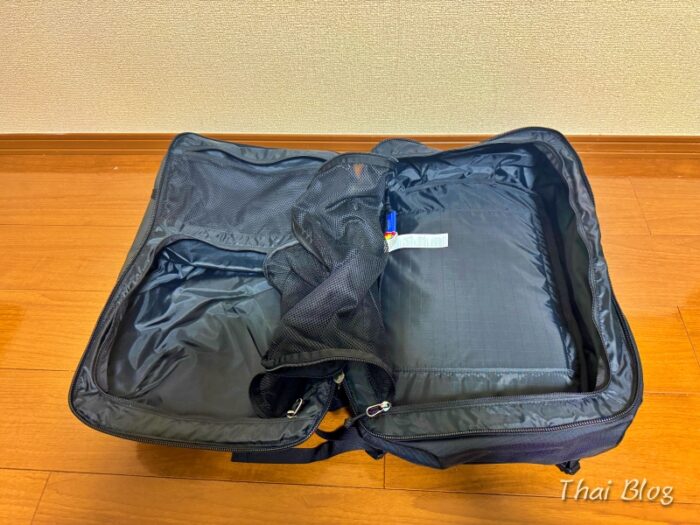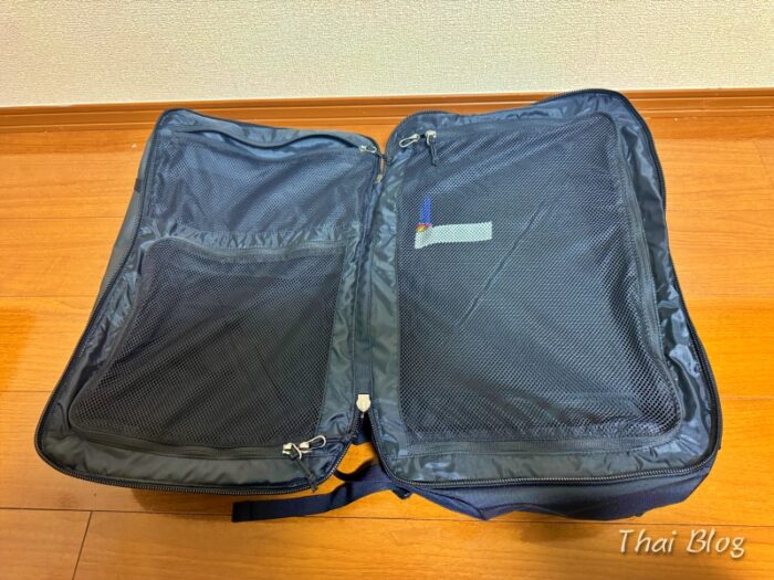 スーツケースと同じ様に180°完全に開けることができて、背中側と表面側の2つのメイン収納部があります。