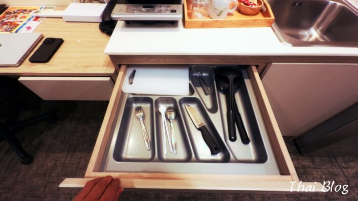 引き出しを開けると、カトラリーや包丁、まな板が美しく整理されていました。