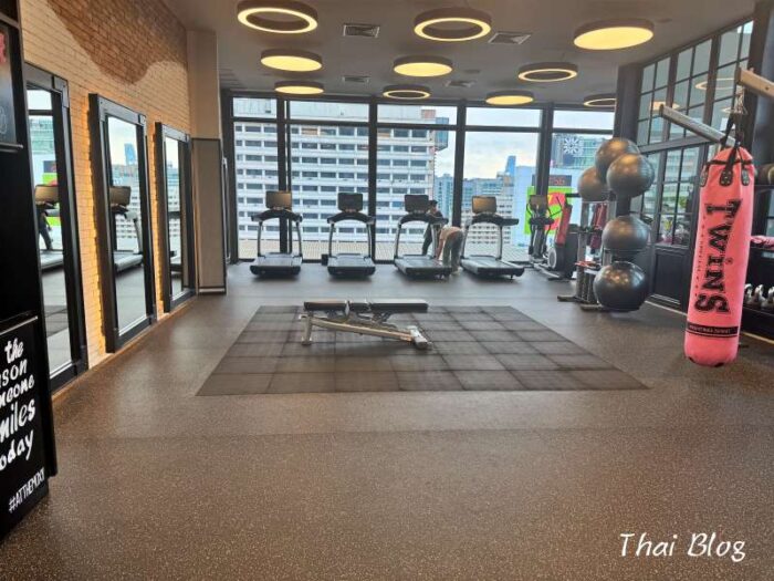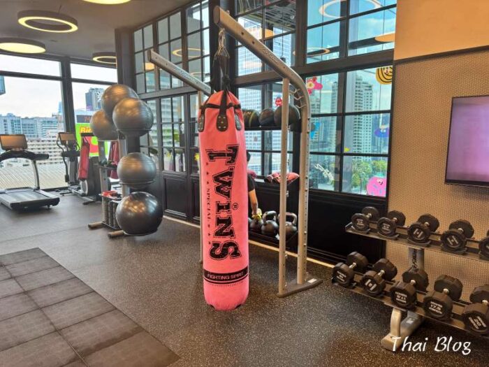 ピンクのサンドバッグがモクシーらしい!旅先でもしっかり体を動かしたい僕には、最高の設備でした。