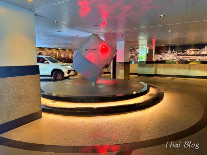 ホテルのエントランスには、回転するキューブ型のオブジェが配置されており、個性的なデザインが印象的です。
