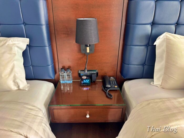 ナイトテーブルにはランプ、時計、電話、ミネラルウォーターが用意されています。