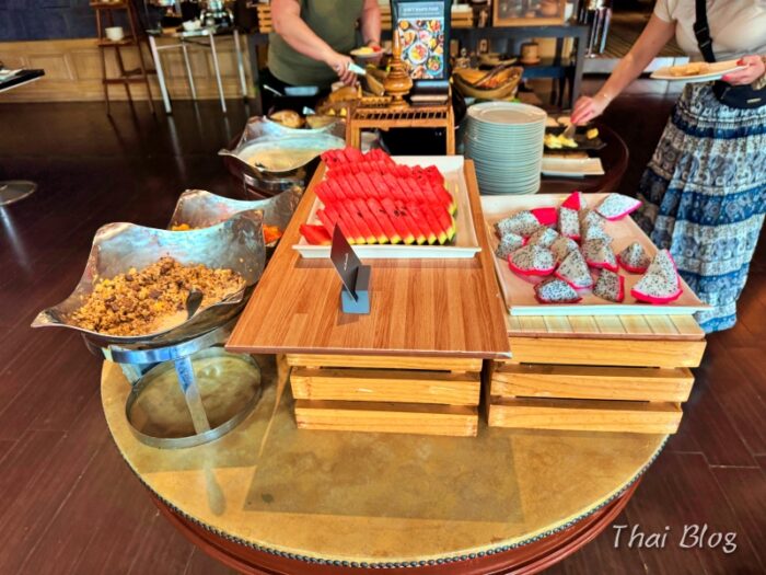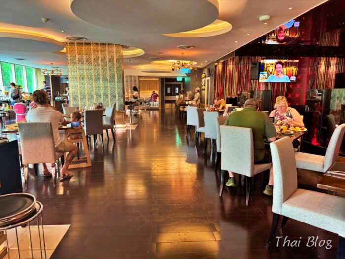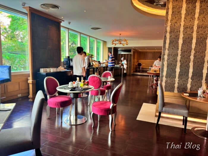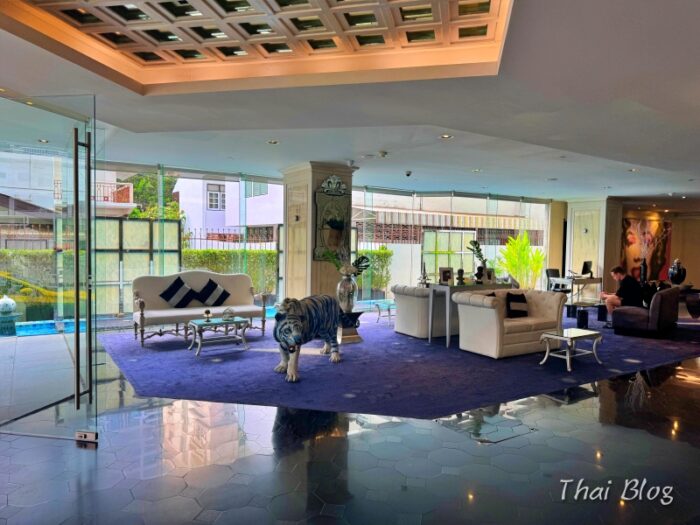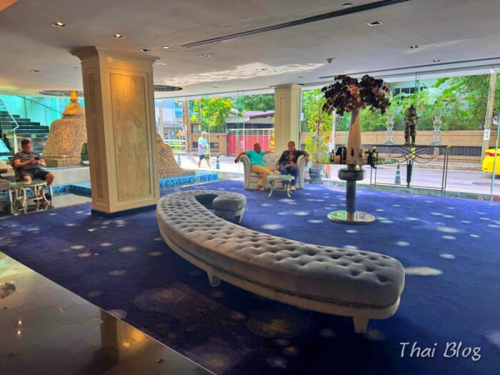 ラウンジスペースには、長いソファやタイの仏閣をイメージした豪華なインテリアが配置され、リラックスできる空間が広がっています。