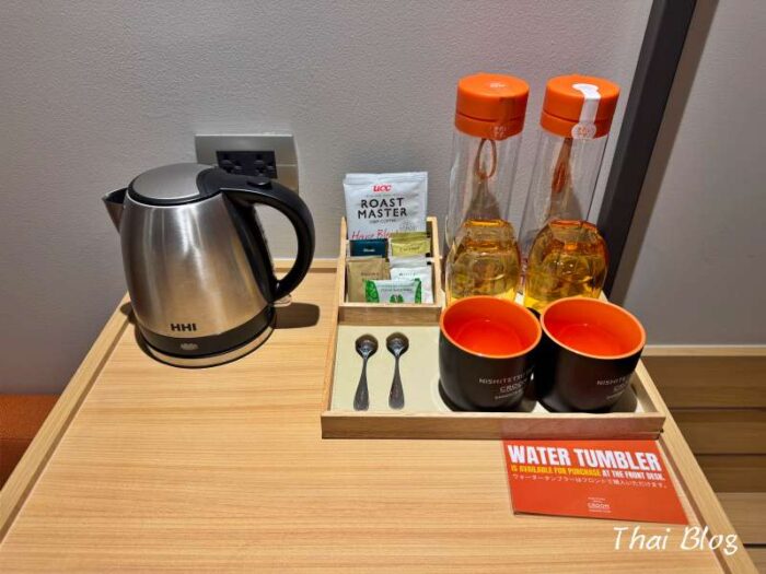 無料のコーヒーと紅茶、そしてお洒落なデザインのウォーターボトル。