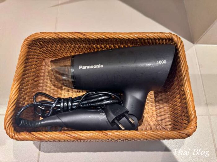 籐のバスケットに収められたドライヤー。