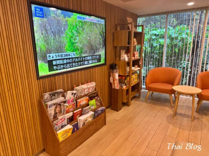 ロビーの片隅には雑誌棚と大型テレビ。