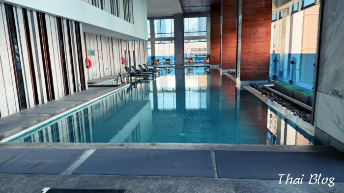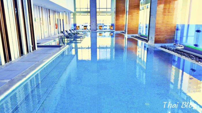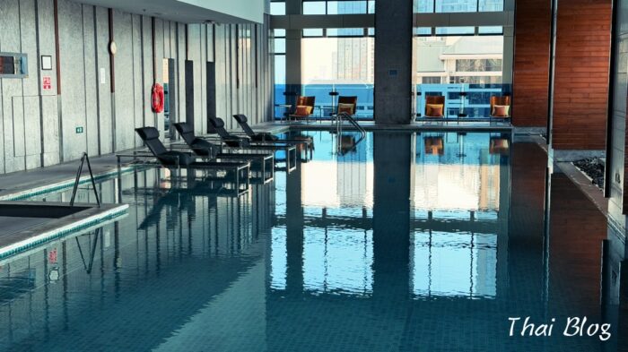 - 都会のパノラマを楽しめる室内プールの雰囲気