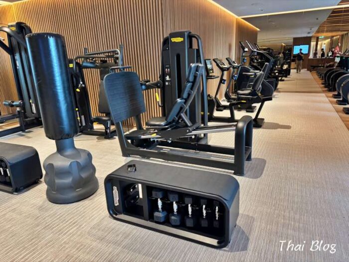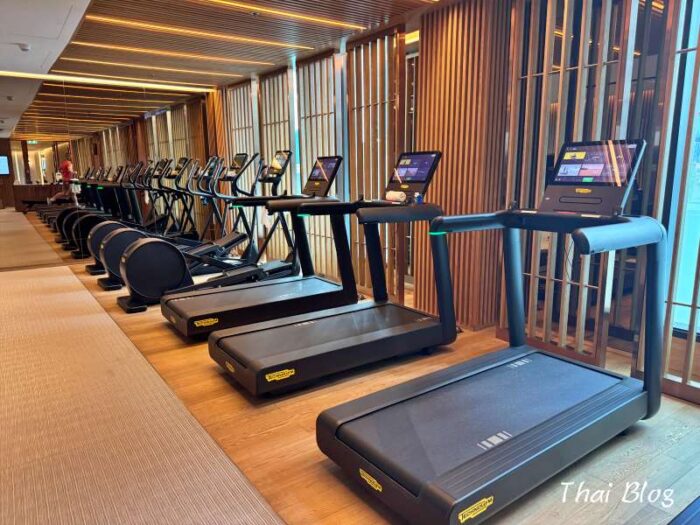 トレッドミル、エリプティカルなどがずらりと並び、どのマシンにも大画面のモニターが搭載。木目調の壁が、自然光と相まって、都会にいることを忘れさせてくれるような、清潔で明るい空間です。