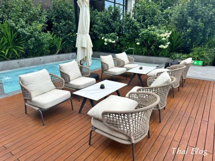 プールサイドにありながら、緑の植栽に囲まれており、まるでリゾートホテルのテラスにいるようです。