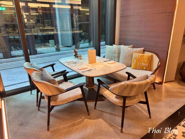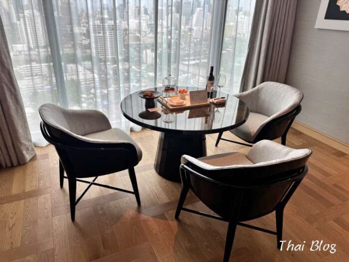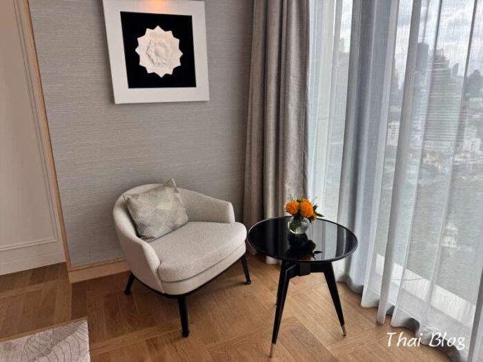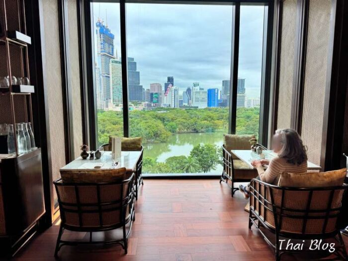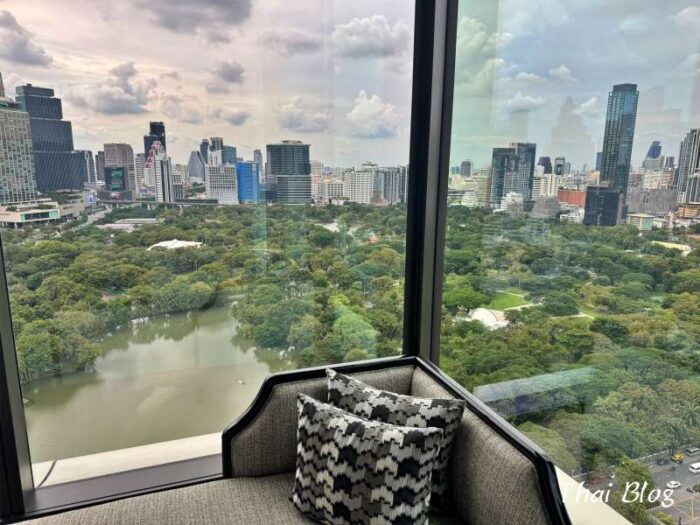 窓際には、ルンピニ公園の絶景を独り占めできる、シックなアームチェアと小さなテーブルが配置されています。