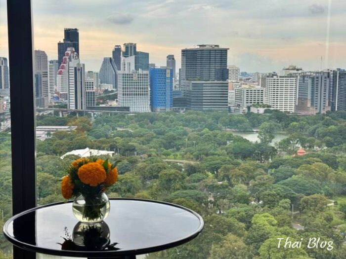 ルンピニ公園の緑の海と、高層ビル群を見渡すダイナミックなパノラマビューを独り占めできます。