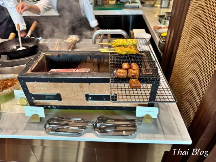 炭火焼きのような香ばしさを提供するオープンな調理台には串焼きやソーセージが並んでいます。